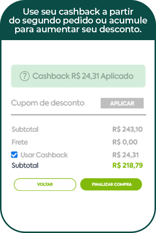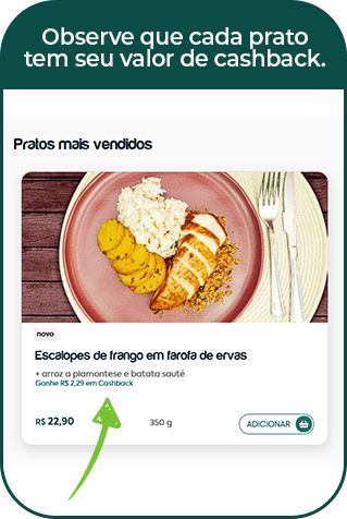 Cada prato que você compra gera um cashback exclusivo, que poderá ser utilizado como crédito nas suas futuras escolhas saudáveis.